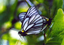 求愛中(拒絶中)蝶(成虫)の発生は7月上旬から8月2週頃までで、7月3週頃が最盛期です。色彩は地色が白く翅脈が黒。オスはメスより鱗粉の発達が強くメスより1週間ぐらい早く羽化します。大きさは前翅長30〜40mmくらいでオスよりメスの方が大きい。飛び方は滑空型で木の葉がひらひら舞うのに似た雅な飛び方をします。ハクサンフウロやアザミを好んで吸蜜し、吸水は湿地や路上でもします。
