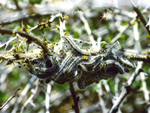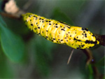 産卵中産卵は7月末頃から見られます。産卵場所は食草−メギ科−の新芽を好み、葉の裏面に立体状に100〜200個もの卵を産み付けます。卵の形は弾丸型、高さ1.2mm位で黄色、縦皺があります。メスは産卵後次第に鱗粉が衰退して翅が半透明になり死んでしまいます。蝶になってから7日から10日くらいの寿命だといわれています。