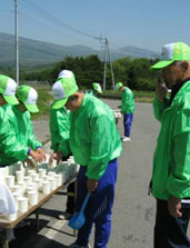 マラソンコース上の三箇所で救護と給水作業を担当。 当会員と中学生を三班に分け作業を担当。 担当給水所でテーブルを等間隔に並べ、やかん、柄杓を使ってコップ半分ほどに水を入れテーブル上に等間隔に並べる。 時間が有る時は選手に手渡しでコップを渡す。 水の補給作業。 コップの回収作業。 |