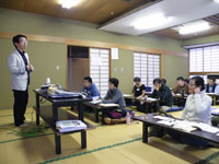 終了後、この体験学習プログラムを高校生にした場合、良かったところと改善すべきところを指摘する2班に分かれてグループワーク。受講者から高校生の修学旅行での体験プログラムとしては講義内容が長く難しいなどの意見が出ていたが、それもそのはず、実際には主催者の思惑は、この体験プログラムを評価してもらうだけではなく、インタープリター・インストラクターと今後名乗っていく受講者に対して、今後当地において成長するであろうマーケットの「森林セラピー」とは何ぞやと、講義していたのである。内容が難しくて当たり前。本来は高校生にする講義ではない。