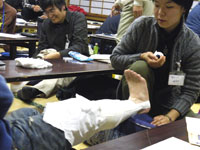 長らく自衛隊で安全・救護に従事してきた小林講師の講座である。まずは野外活動における救急法、次に冬季に見られる疾患について学習。一通り座学をやってから、いよいよ実際の包帯の使い方、巻き方、テーピングの使い方の練習を行う。ある程度時間を取ったので、ペアになって全員が一通り訓練をすることができた。こういうものはたまにやっておかないと忘れてしまう。聞いただけでは役に立たない。