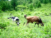 湯の丸牧場は、長野県小県郡東部町の牧野組合が明治37年に開設しました。牧場の所有者は嬬恋村鹿沢温泉の紅葉館主小林亀蔵氏でした。当時は畜産業が盛んで湯の丸山が牧場に適していたことから年間300頭(牛・馬・綿羊)もの放牧頭数がありました。現在の放牧頭数は年間30頭(牛)に満たない状況です。この放牧頭数の減少は牛肉の輸入自由化による畜産業の低迷が大きな要因と考えられます。